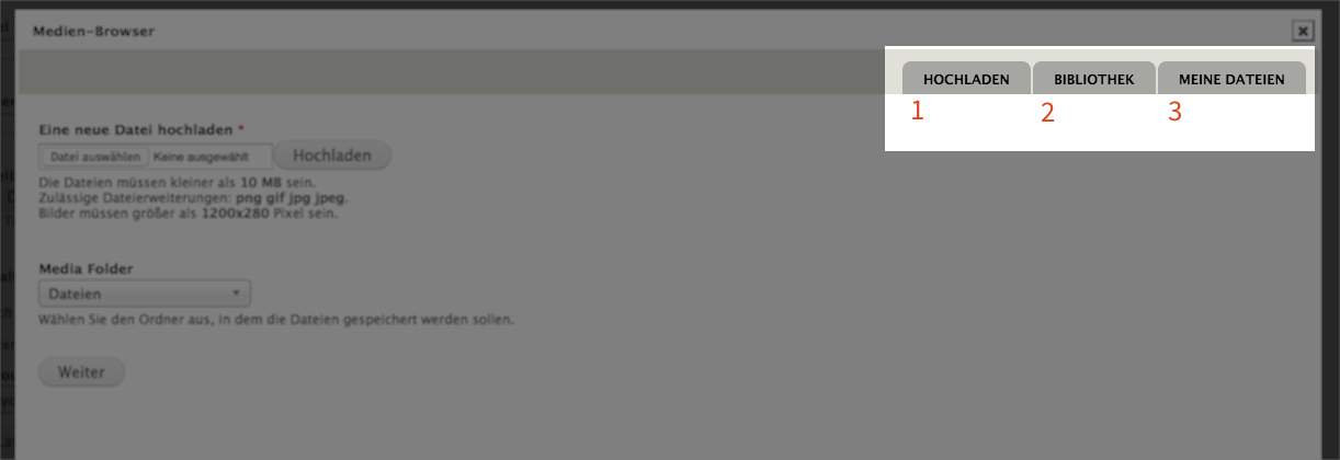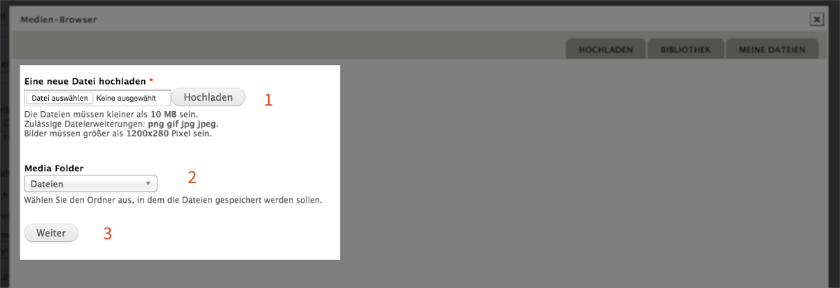 Dort haben Sie die Möglichkeit, eine neue Datei hochzuladen (1) oder eine bereits vorhandene Datei aus dem gesammelten Medien-Archiv der Website (2) oder dem Katalog der von Ihnen bereits vorher hochgeladenen Dateien (3) auszuwählen.