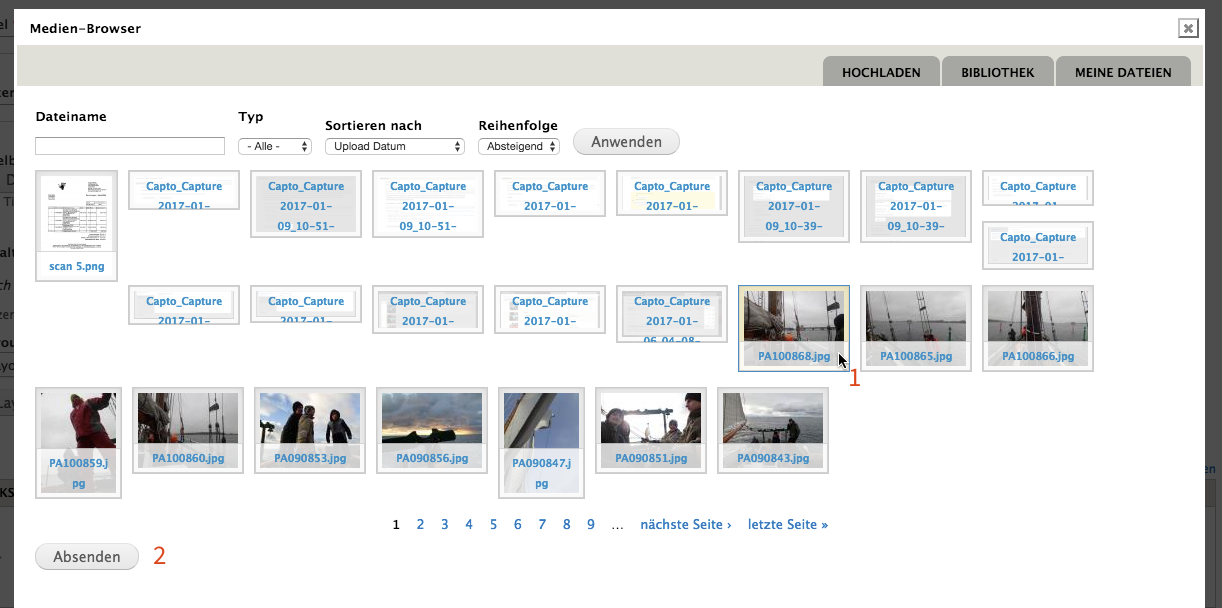 Klicken Sie in der Ansicht Bibliothek oder Meine Dateien auf das kleine Vorschaubild der Datei, die Sie nutzen wollen (1). Klicken Sie dann auf Absenden (2) um die Datei hinzuzufügen.