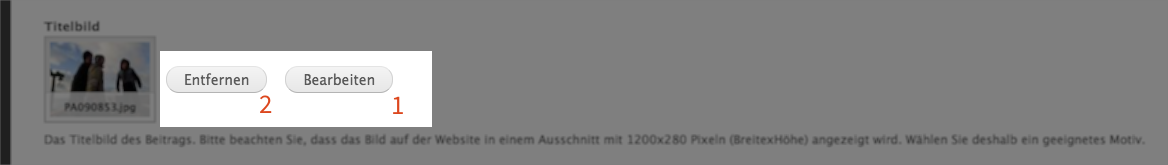 Klicken Sie in einem Dateifeld auf Bearbeiten (1) um die bereits ausgewählte Datei zu bearbeiten oder auf Entfernen (2), um eine neue Datei auszuwählen oder hochzuladen. Beachten Sie, dass die Datei selbst nicht gelöscht wird, wenn Sie Entfernen klicken. Sie verbleibt zur späteren Nutzung im Medien-Archiv.